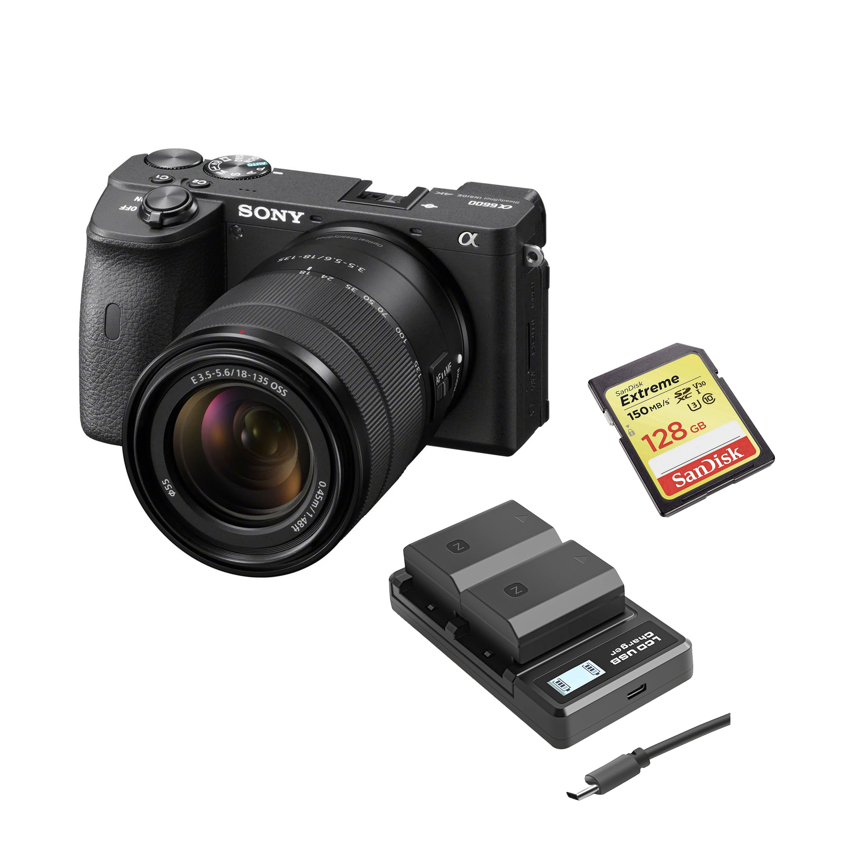 camera, 18–135mm lens, 2 batteries & 128GB SD